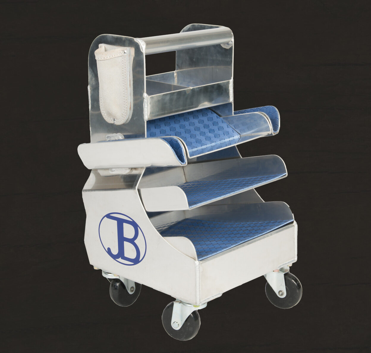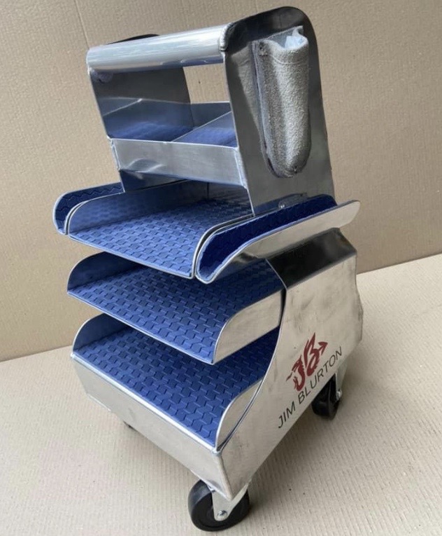 The Jim Blurton Aluminium Tool Box is manufactured from high quality aluminium and seam welded for extra strength. It incorporates two leather knife pouches, to avoid damage to the blades, two rasp sleeves and angled shelves to prevent the tools from sliding out. The shelves also have rubber mats for further tool protection. The box is mounted on four casters and can easily be moved around the shoeing area.